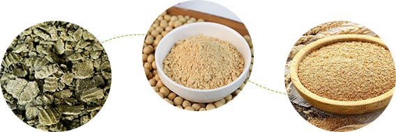 Every fish feed plant has a different formula. Usually the main raw materials for fish extruded feed are soybean cake, soybean meal, wheat bran, fish meal, bone meal, starch, multivitamins, vitamin premixes, special additives, etc.